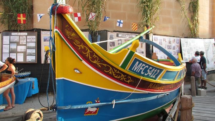 A traditional Maltese boat brightly painted and notice the eye on the front which is painted on each side to protect those who travel aboard.
